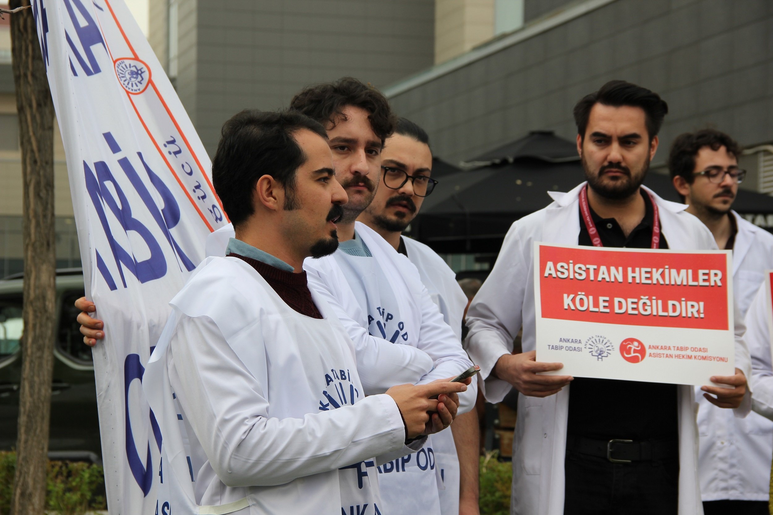 Ankara Tabip Odası Asistan Hekim Komisyonu’nun düzenlediği açıklamaya ATO Başkanı Dr. Mine Coşkun, Genel Sekreteri Dr. Kemal Oskay ve Yönetim Kurulu Üyesi Dr. Alpertan Açar’ın yanı sıra Sağlık ve Sosyal Hizmet Emekçileri Sendikası ile Hekim Birliği Sendikasının temsilcileri de katıldı.