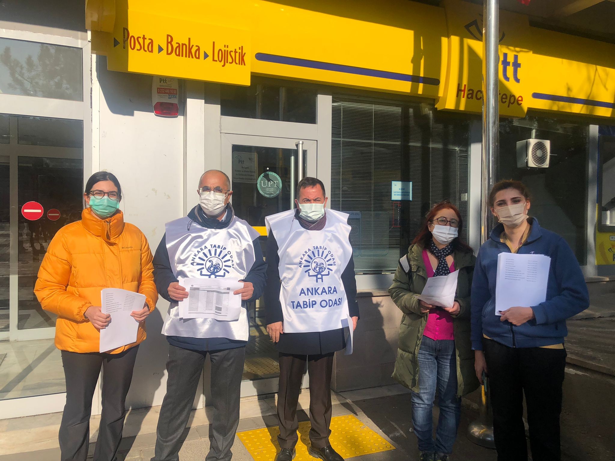 Türk Tabipleri Birliği’nin (TTB) çağrısıyla hekimler PTT bürolarından faks çektikleri bordroları ve taleplerini içeren yazıları TBMM Başkanı’na, TBMM Başkanvekillerine ve siyasi parti merkezlerine gönderdi.